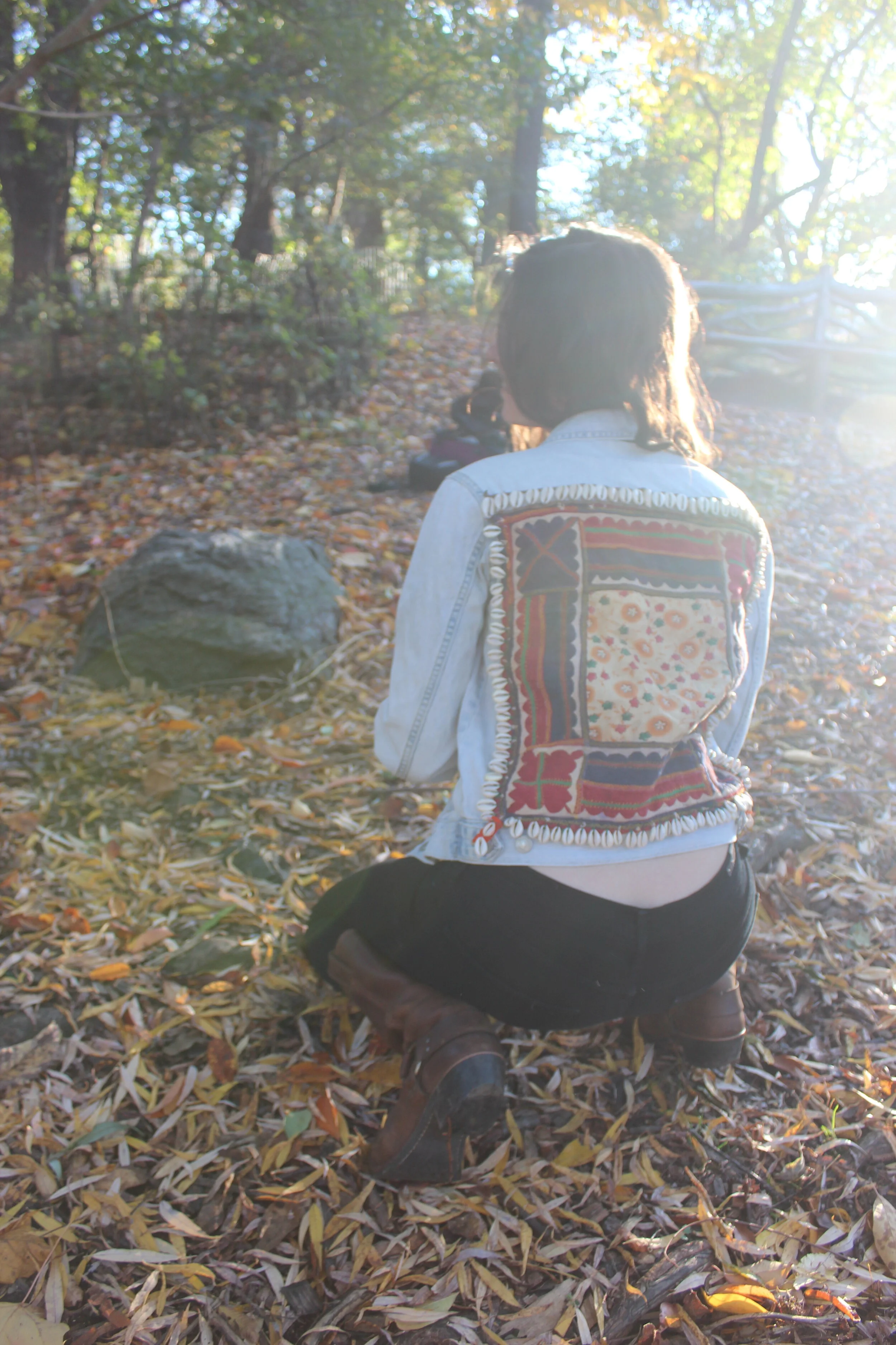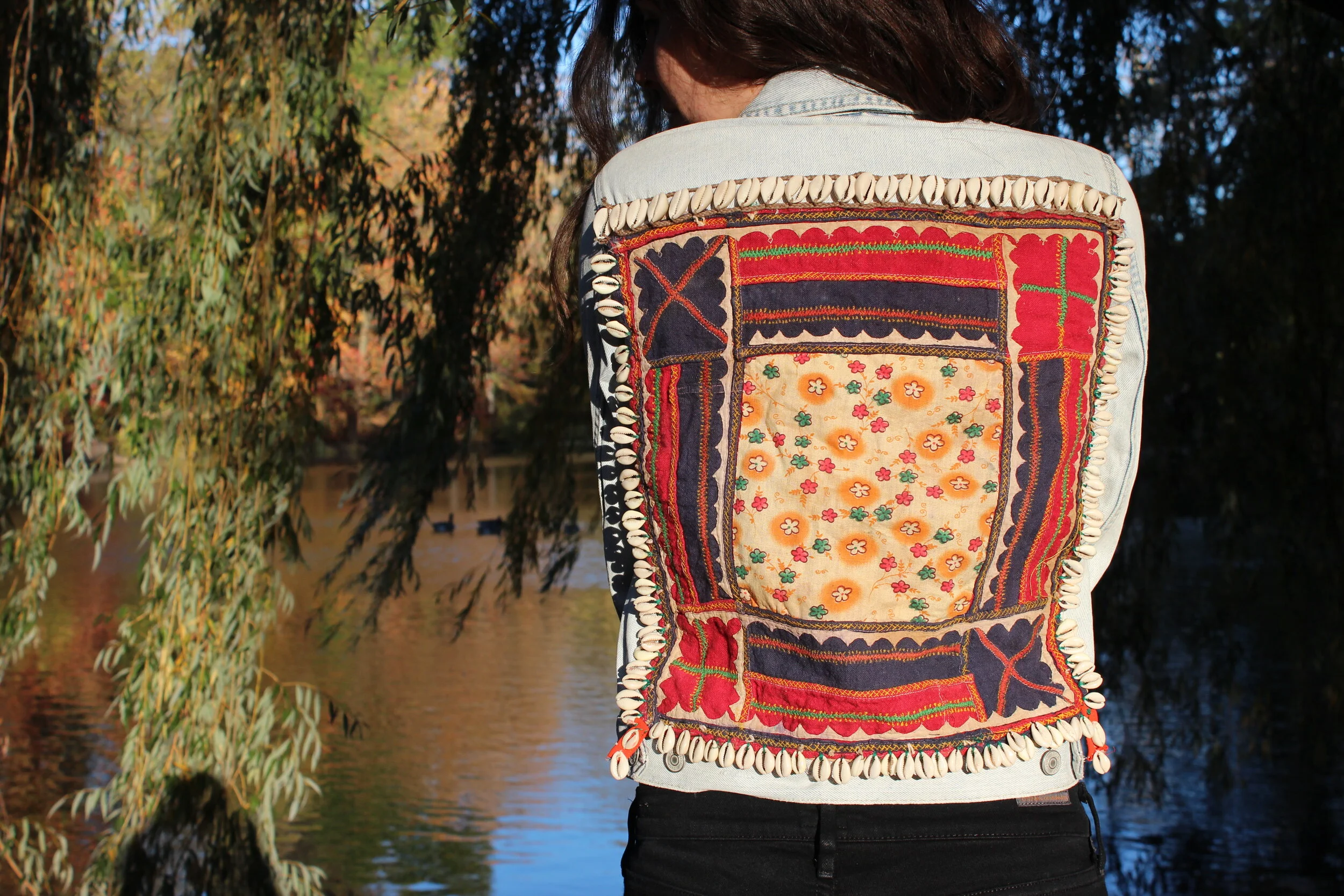 Take Me to India Jacket is a one-of-a-kind upcycled jacket made with Bhandari textiles and hand-sewn cowrie shells handmade by female artisans in India, then collected and designed on denim, to modernize and value the beauty of Indian culture and textiles.